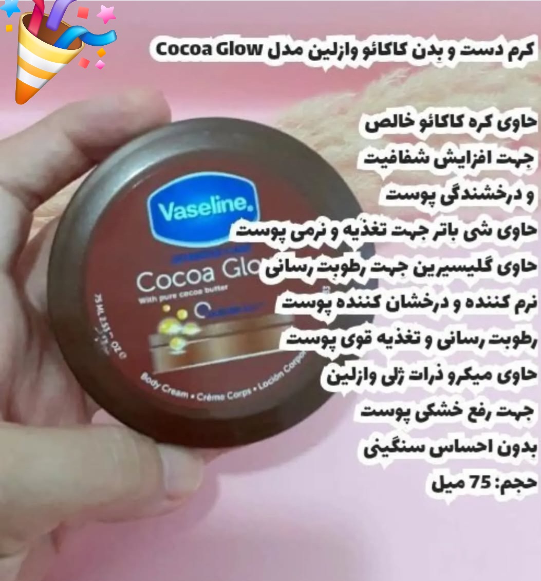 کرم بدن کره کاکائو وازلین Vaseline مدل cocoa Glow ، مناسب انواع پوست و پوست خشک میباشد.