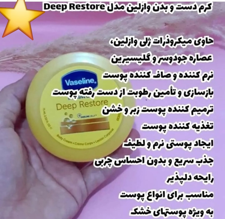 کرم مرطوب کننده و بازسازی کننده بدن وازلین Vaseline Deep Restore دارای فرمول مغذی جهت تغذیه و احساس پوستی نرم و هموار با بازسازی و احیای رطوبت از دست رفته آن می باشد. کرم بدن وازلین حاوی عصاره جوی دو سر جهت تغذیه و لطافت بخشی پوست به همراه گلیسیرین جهت رطوبت رسانی و میکرو ذرات ژلی وازلین جهت رفع خشکی پوست می باشد. این فرمول تایید شده کلینیکال است و با جذب سریع و بدون احساس چربی، خشکی پوست را پس از اولین استفاده برطرف می کند.